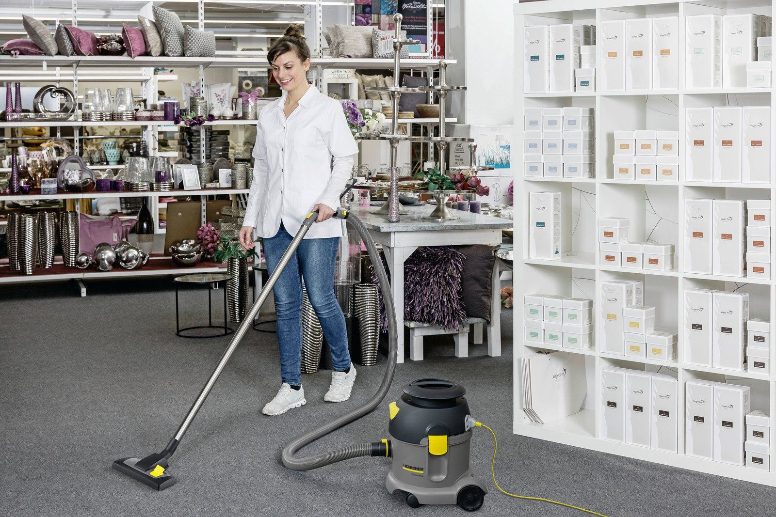 Der speziell für Profis in der Gebäudereinigung entwickelte Trockensauger T 10/1 Adv sorgt dank des handlich geformten, antistatischen Krümmers mit Clipsystem, stufenloser Saugkraftregulierung und des großen Fußschalters für komfortables, ergonomisches und rückenschonendes Saugen ganz ohne lästiges Bücken. Dabei ermöglicht der Permanent-Hauptfilterkorb das Reinigen mit oder ohne Filtertüte, während der große und gleichzeitig sehr robuste und schlagfeste Container durch eine umlaufende Stoßkante Möbel und anderes Inventar zuverlässig vor Beschädigungen schützt. Das 12 Meter lange, steckbare Netzkabel mit unverwechselbarem gelben Netzstecker erlaubt bei Bedarf einen einfachen, zeit- und kostensparenden Kabelwechsel. Eine Kabelaufwicklung am Gerätekopf hält das Kabel beim Transport ebenso sicher verstaut wie die integrierte Aufnahme alle wichtigen Zubehöre. Serienmäßig mit dabei sind 2 langlebige Metallsaugrohre (je 0,5 m lang), ein Saugschlauch, ein Antistatikkrümmer zur Reduzierung elektrostatischer Entladungen, eine umschaltbare Bodendüse (280 mm) für Hart- und Teppichböden sowie eine Vliesfiltertüte.